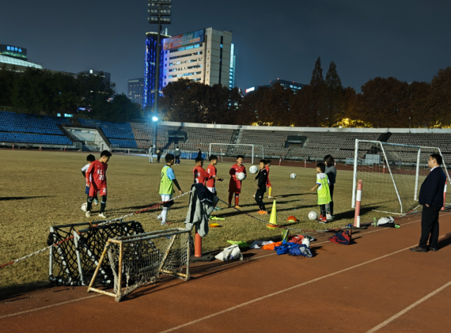 草地球场上,还有一群上足球课的孩子练着颠球。