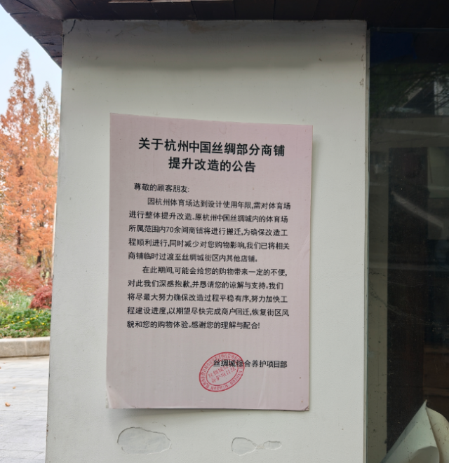 此外,同样要进行施工改造的还有与体育场“贴隔壁”的中国丝绸城一排店铺,约70家。这些店铺,主要与体育场沿街的西区、南区、北区看台相连接。记者也看到了一张提升改造的公告。“因杭州体育场达到设计使用年限,需对体育场进行整体提升改造。原杭州中国丝绸城内体育场所属范围内70余间商铺将进行搬迁,为确保改造工程顺利进行,同时减少对您购物影响,我们已将相关商铺临时过渡至丝绸城街区内其他店铺。”