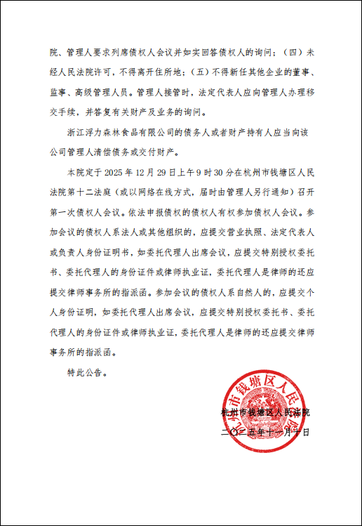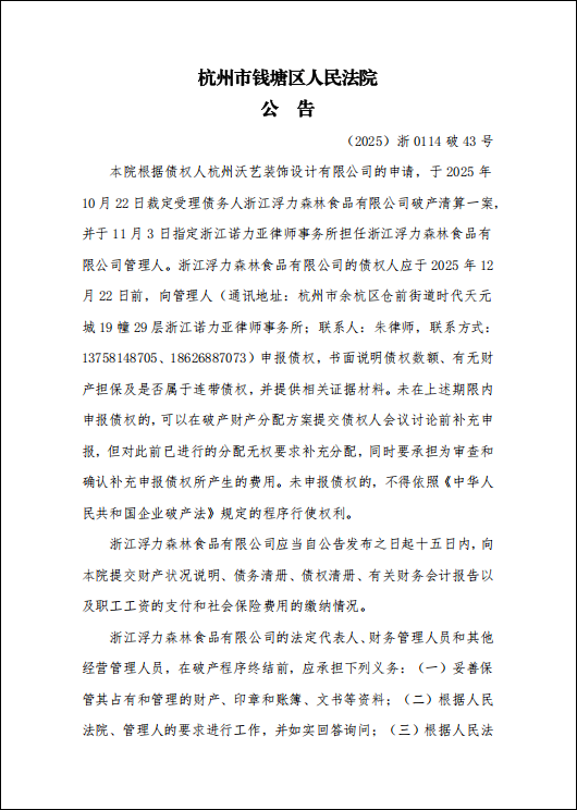 根据杭州市钱塘区人民法院公告,法院已于今年10月22日裁定受理债权人杭州沃艺装饰设计有限公司对浙江浮力森林食品有限公司的破产清算申请,并于11月3日指定浙江诺力亚律师事务所担任管理人。公告明确,债权人需在12月22日前向管理人申报债权,书面说明债权数额、担保情况等并提交证据。12月29日法院将召开第一次债权人会议。