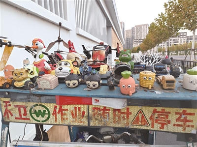 环卫车头的顶端粘满了各式各样的玩具,有七个葫芦娃、八爪鱼、小熊、鸭子、恐龙、蓝象、白鹿、猴子、玩具车、玉米、胡萝卜、变形金刚、直升机、大飞机……