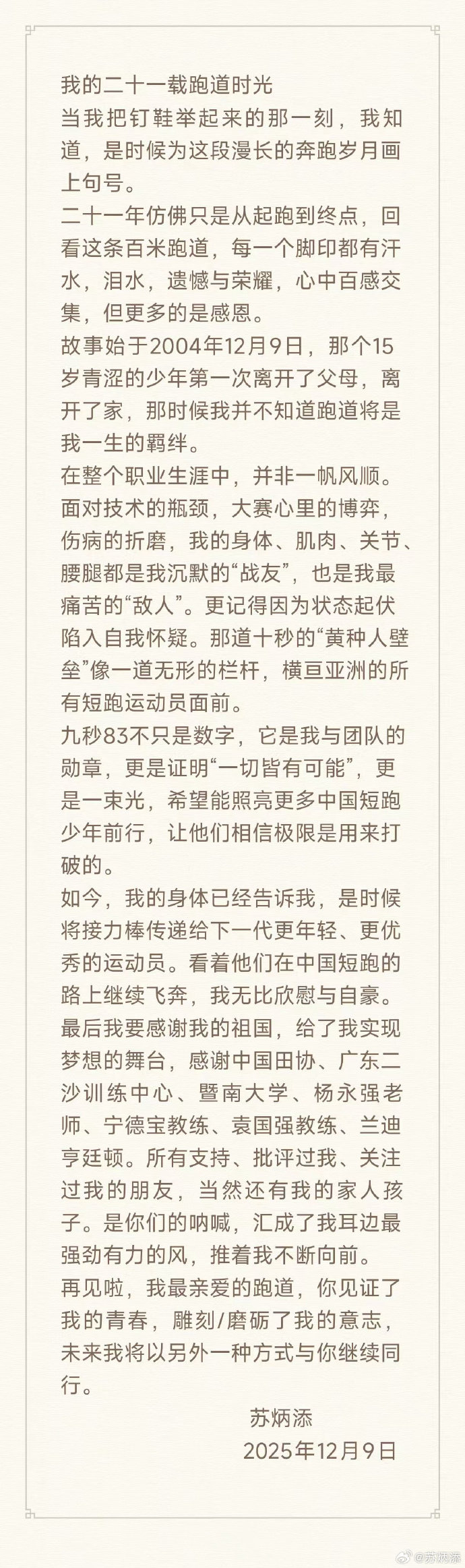 刚刚,苏炳添在个人社交账号发布长文,官宣退役,“再见啦,我最亲爱的跑道”。