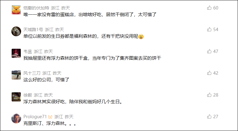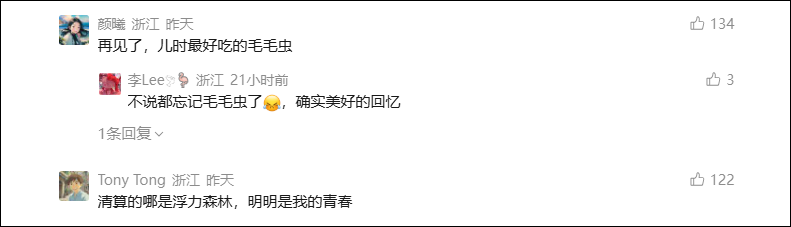 网友“颜曦”说,“再见了,儿时最好吃的毛毛虫。”网友“Tony Tong”留言,“清算的哪里是浮力森林,明明是我的青春。”网友“韦昷”晒出了回忆,“我抽屉里还有浮力森林的饼干盒,当年专门为了集齐图案去买的饼干。”