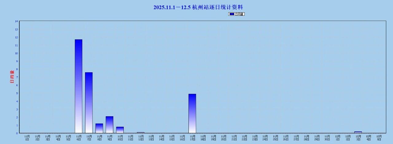 虽然12月3日的降水量仅有0.2毫米,但正如很多网友所说:“苍蝇腿也是肉”。毕竟,在此之前(11月18日至12月2日),杭州已经连续15天没有有效降水。而这之后一直到12月11日又是连续一周的无雨天气。