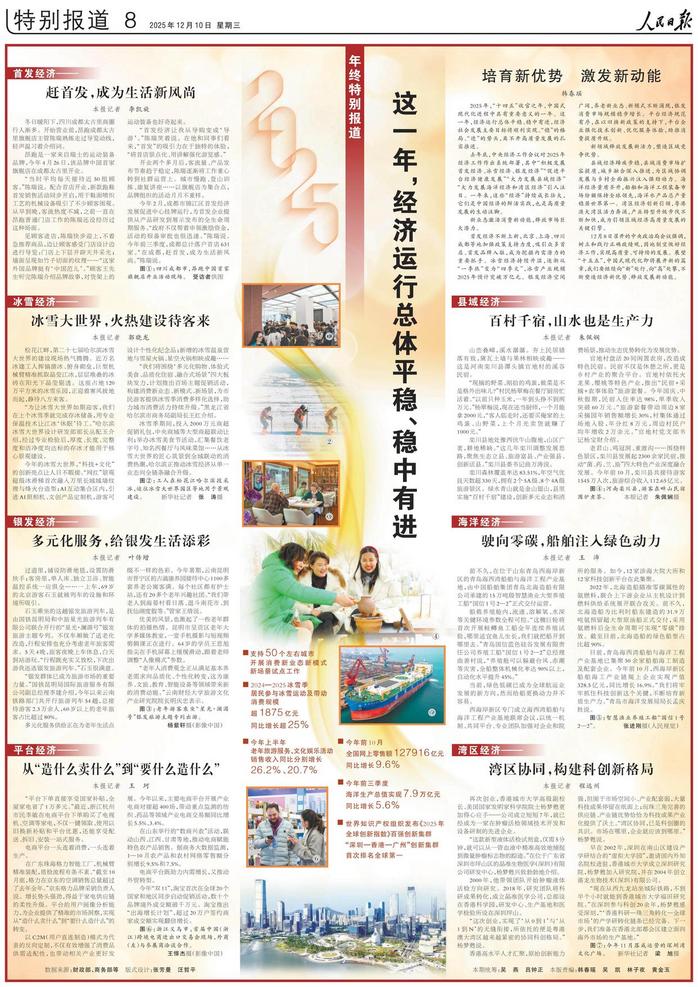 去年底,中央经济工作会议对2025年经济工作作出系统部署,其中“积极发展首发经济、冰雪经济、银发经济”“促进平台经济健康发展”“大力发展县域经济”“大力发展海洋经济和湾区经济”引人注目。一年来,这些“经济”持续成长壮大,它们是中国经济的鲜活实践,也是高质量发展的生动注脚。