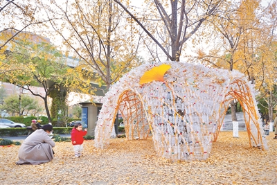 “目前完成的几个装置‘落叶相框’‘瓶筑鸟巢’和‘落叶伞’都是用居民生活、生产的废料、可回收物制作的。”拱墅区综合行政执法局办公室工作人员廖冰介绍,“我们参考了许多已有的比较火的打卡造型,最终选择了和银杏叶更融合的设计。”