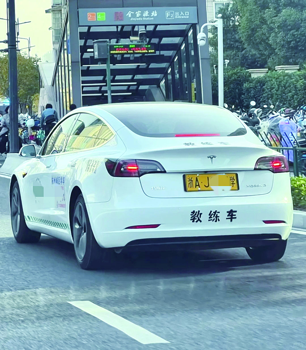 照片显示,一辆白色特斯拉model 3在路上行驶,黄色号牌“浙A·J××学”和 “教练车”字样格外显眼。