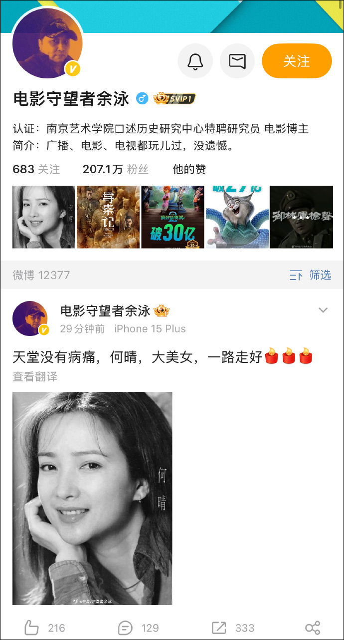 “电影守望者余泳”向扬子晚报记者证实了这一消息,他于社交平台发布何晴的黑白肖像照,并配文“天堂没有病痛,何晴,大美女,一路走好”,引发网友与演艺圈人士的集体缅怀。
