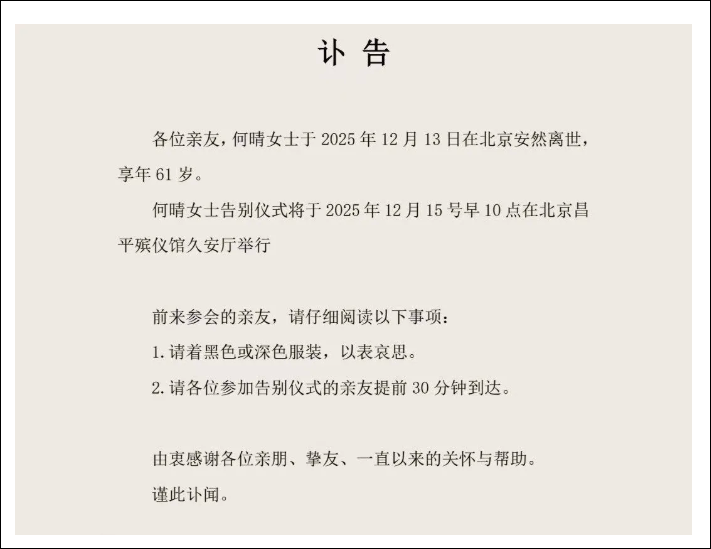 都市快报讯 12月13日,一份家属发布讣告显示,曾出演过各“四大名著”的女演员何晴于2025年12月13日在北京安然离世。其告别仪式定于2025年12月15日上午10点在北京昌平殡仪馆久安厅举行。