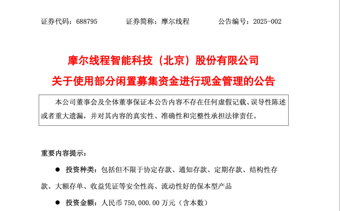 金融时报讯 12月12日,“国产GPU(图形处理器)第一股”摩尔线程发布公告,公司及实施募投项目的子公司计划使用最高不超过75亿元(含本数)的闲置募集资金进行现金管理。购买包括但不限于协定存款、通知存款、定期存款、结构性存款、大额存单、收益凭证等安全性高、流动性好的保本型产品。