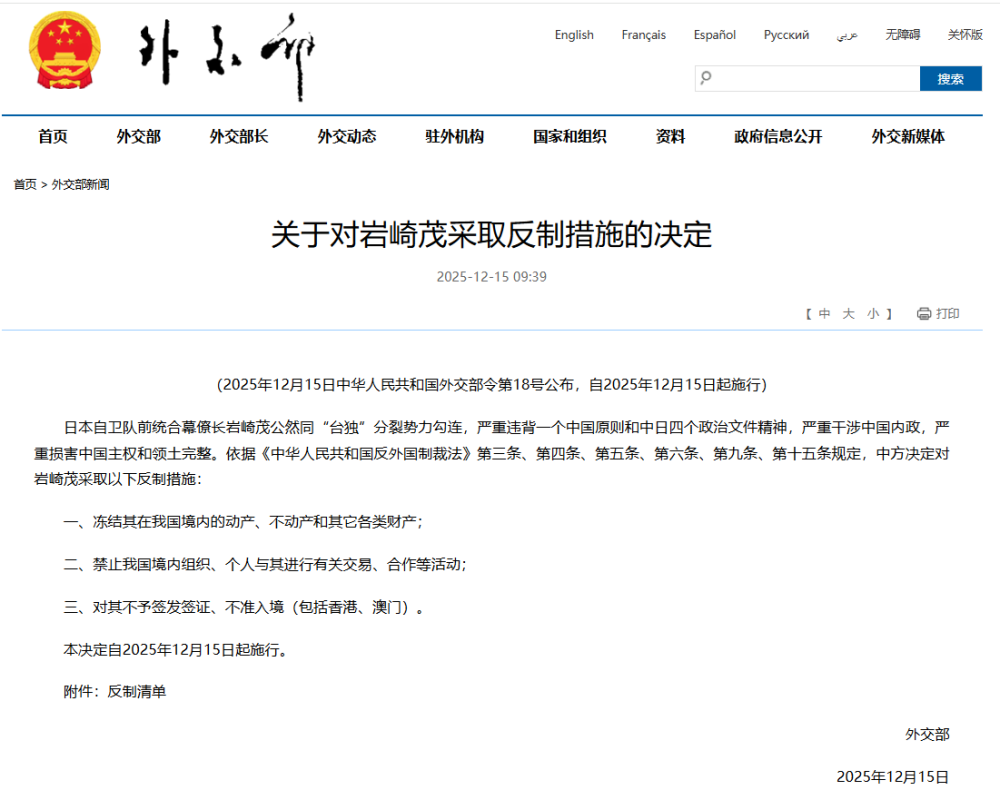 日本自卫队前统合幕僚长岩崎茂公然同“台独”分裂势力勾连,严重违背一个中国原则和中日四个政治文件精神,严重干涉中国内政,严重损害中国主权和领土完整。依据《中华人民共和国反外国制裁法》第三条、第四条、第五条、第六条、第九条、第十五条规定,中方决定对岩崎茂采取以下反制措施: