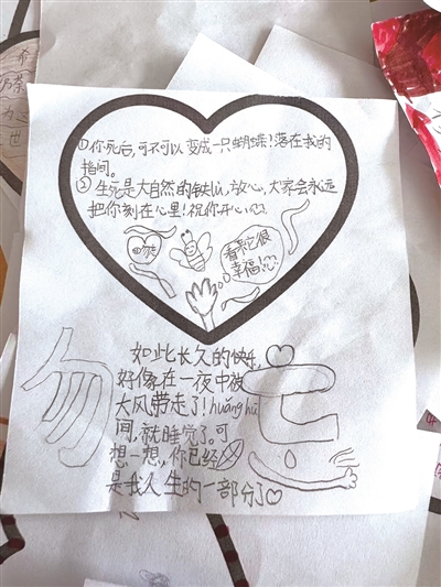 纸条上,孩子们的留言真挚又感人,他们认真地探讨“死亡”,也给予“奶茶”最童真的祝福。