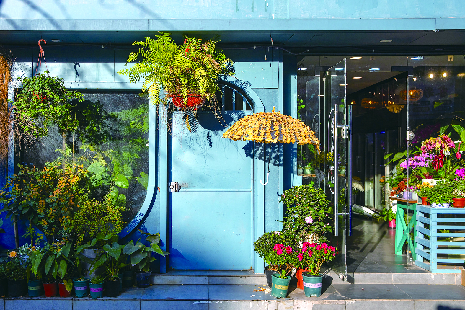 孩儿巷,花店门口挂着一把银杏叶雨伞。记者 陈中秋 摄