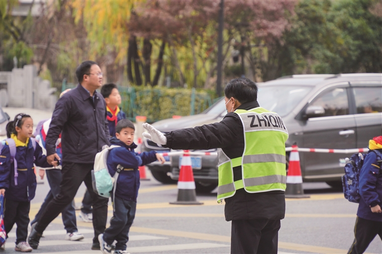 最近,杭十四中附校60岁老校长吴斌,因为一则护学视频火上了热搜。今年年底即将退休的吴校长,教龄42年,每天6点到校,坚持护学34年,温暖了很多人。他说:“学生的安全是最重要的,我想坚持守好最后一班岗。”图为昨天早上7点多,杭十四中附校南门外,吴校长身着反光背心指挥交通,保障家长学生安全有序通行。