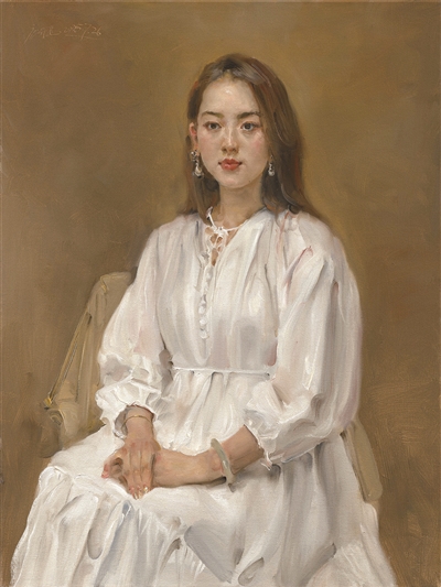 前者描绘都市女性的时尚与轻盈,后者聚焦民族服饰的斑斓节奏。“《畲族姑娘》画的是杭州桐庐的一个畲族姑娘,她的服饰是重点,面部刻画反而简练;《白裙女孩》画的则是一个北京的都市女孩,更注重神态与环境的互动,显得轻松而愉快。”