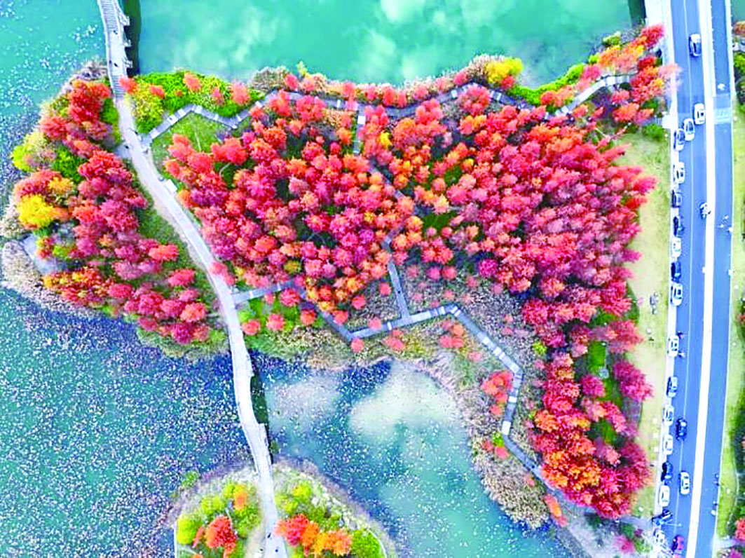 首推越王路老虎洞路段,沿线的水杉林占地70亩,沿道路两侧铺展。湖山广场的水杉则更为灵动纯粹。冬日暖阳下,红杉灿烂夺目,近处的残荷清冷疏朗,远处的湖面波光粼粼,颇有“半江瑟瑟半江红”的诗意。在踏歌桥,桥畔的水杉临水而居,站在桥的圆弧拱线上回望,水杉的红、苇草的黄、湖水的蓝层次分明,远处的定山轮廓淡成水墨画的背景。