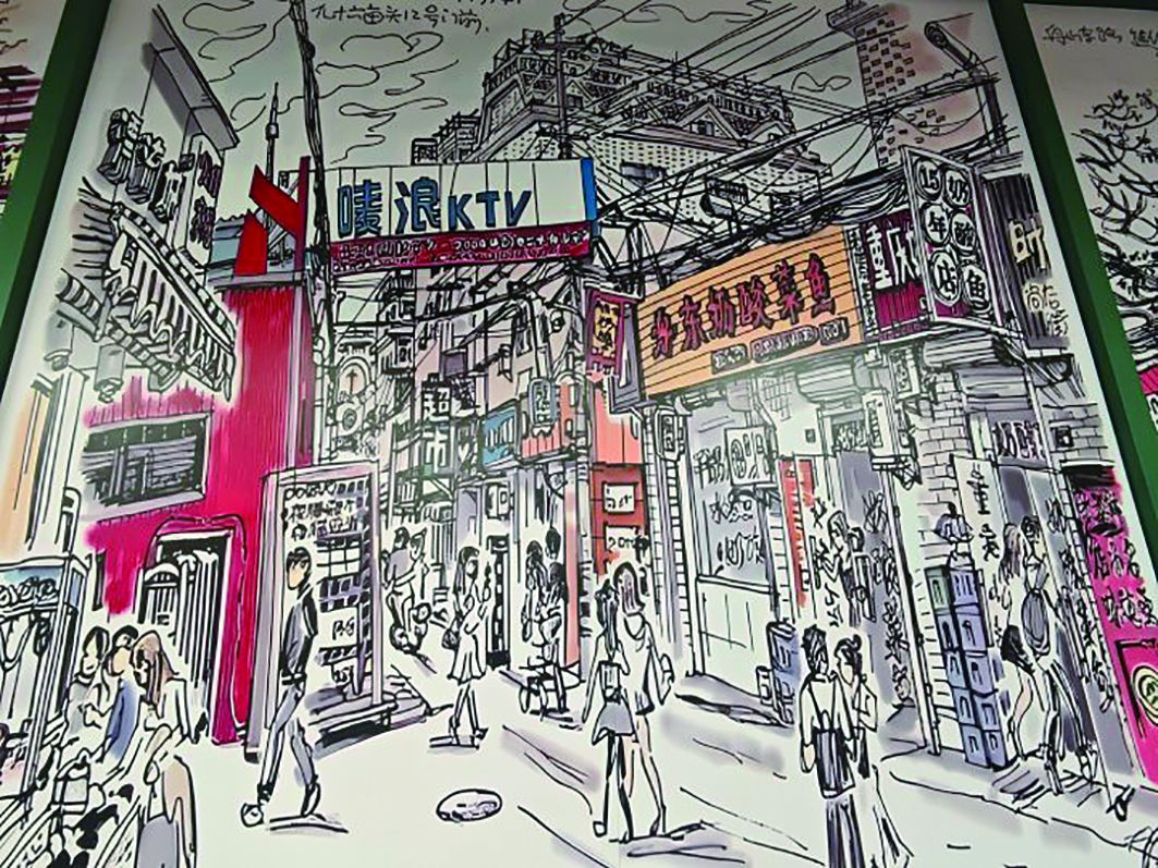 进到店里,满墙的壁画格外吸引人,是拆迁前的舟山东路简笔画:拥挤的街巷,电线缠绕“蛛网”般的天际线,红绿的招牌,网吧、唛浪KTV、棋牌室、小旅馆,以及各种小吃店和穿搭时尚的年轻人。