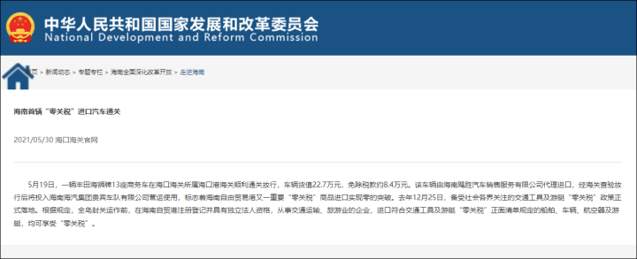 根据《海南自由贸易港 “零关税” 进口交通工具及游艇管理办法(试行)》(以下简称《办法》),符合条件的进口车将直接免征这三项税,所以大幅降低了进口车的车价。以2021年海南首辆“零关税”进口汽车为例(2021年“零关税”政策已落地海口港试运行),价值22.7万元的丰田海狮13座商务车免除税款约8.4万元,相当于降价近40%。