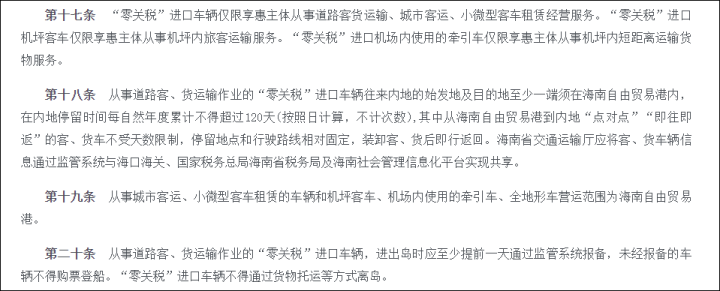 就算你通过企业渠道获得了购买资格,也会受到严格限制。首先,这辆车不能自由转让——即使因为特殊原因需要转让,转让前也应征得海口海关同意并办理相关手续,如果是转让给非享受优惠的主体还应补缴税款;其次,所有“零关税”进口车必须登记为营运性质,意味着15年就要报废;第三,这台车每年在海南以外地区累计停留不得超过120天。