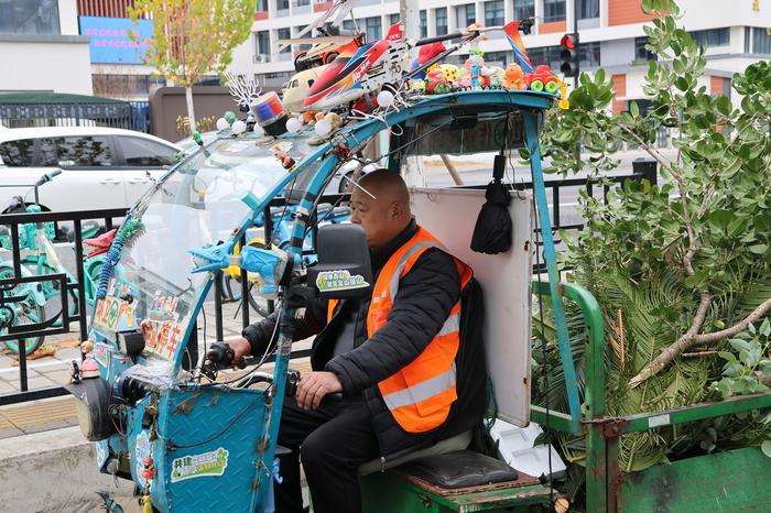 在来到和睦新村之前,郏德轩就有捡玩具装点环卫车的习惯,“环卫车光秃秃的,不如摆点东西上去,还能拉近和居民的距离。”