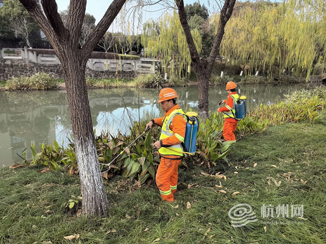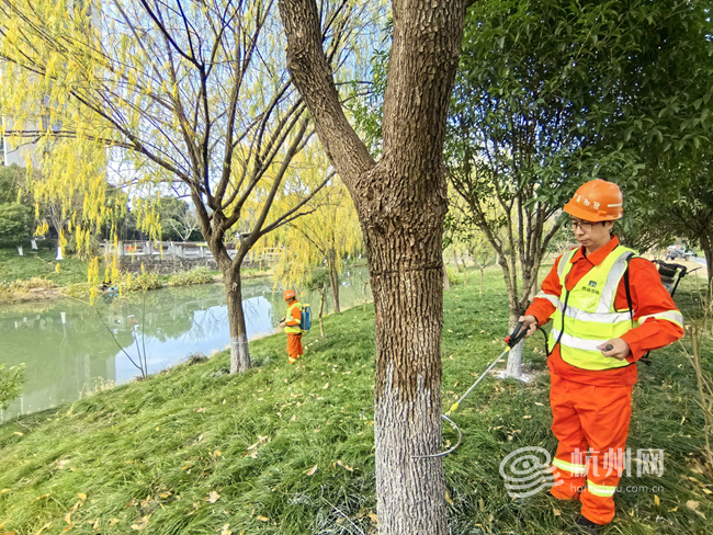 刷白是保护树木安全过冬、防治病虫害的关键养护环节。给树木刷上一层白白的药剂,成了河道养护工每年寒冬之前必须完成的工作。