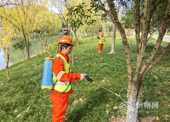 小颜是西湖区市政公司负责备塘河养护的管理员,他说自己其实只是新技术的“搬运工”。他说,去年自己和同事都发现工人干一天“刷白”需要多次弯腰,讨论的第一套方案是使用绿化喷雾器,可以均匀将刷白剂喷到树干上,也解决工人弯腰麻烦。但实际试验后发现,喷雾器喷的药剂,容易喷到行人身上,也会造成药剂浪费。