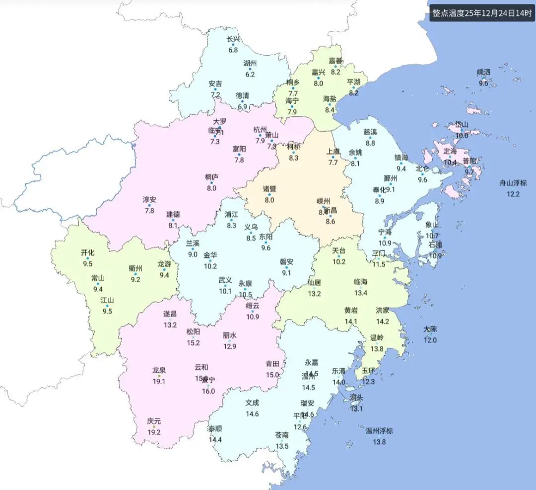 截至16时,我省南北地区气温迥异,南高北低明显,浙北地区的气温几乎恒定,波动范围不足1℃;浙西南地区气温略高一些,大部最高气温有15-19℃,最高庆元19.8℃。