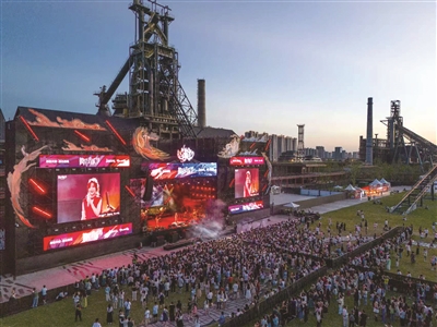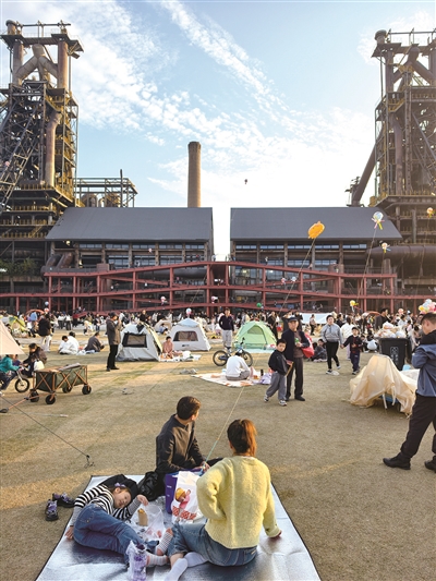 顺着游乐园旁的火车轨道往里走,沿路的机械仪表、钢铁管道、老厂房从身旁一一掠过,几个高大的烟囱高炉出现在眼前,厚重的工业感扑面而来,中间的大草坪上扎着一顶顶样式各异的帐篷。