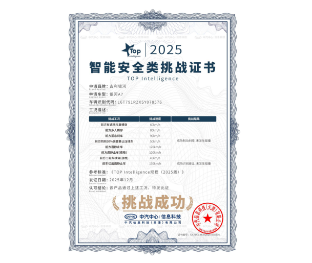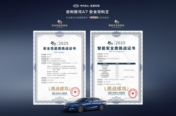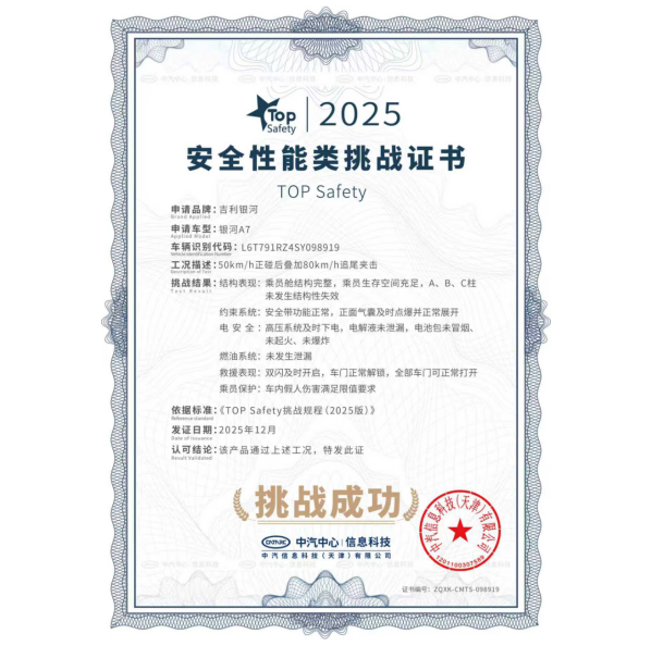 12月25日,吉利银河A7成功通过中汽中心行业首次中型插混轿车“双TOP”顶级安全挑战,成为目前行业唯一同时获颁安全性能类挑战证书和智能安全类挑战证书的的车型。安全家轿认准银河A7!凭借吉利汽车全域安全体系的坚实底座,吉利银河成为了最快达成年销百万辆的新能源汽车品牌,作为银河品牌主打车型之一,吉利银河A7完整继承了吉利的安全基因,凭借7大核心安全实力,成功通过中汽中心安全大考,再次证明其作为十万级混动家轿安全新标杆的颠覆性实力。