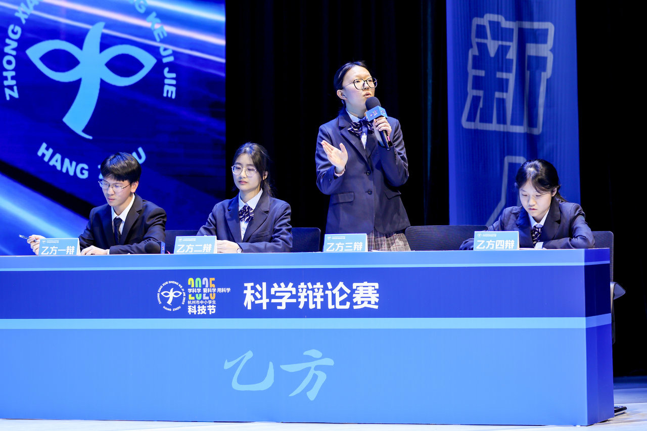 闭幕式上,中学生科学辩论赛总决赛成为一大亮点。以“人工智能的应用会不会削弱人的思维质量”为辩题,为青少年搭建了一个思辨平台。前期54支杭城队伍经过多轮激烈角逐,四支中学队伍脱颖而出晋级总决赛。辩手们围绕技术伦理与人类本质的核心议题展开深度探讨,他们思维敏捷、逻辑清晰,尽显新时代青少年的逻辑思辨与前沿创新视野。