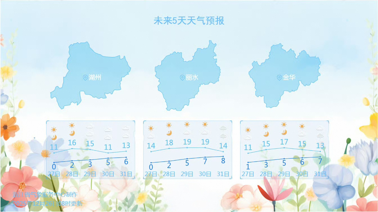 不过,大家肯定对昨天(12月26日)的寒冷心有余悸。受冷空气影响,昨天早晨,除沿海地区外,全省大部地区最低气温都跌破了冰点。湖州(-0.9度)、杭州(-0.5度)、金华(0.4度)、丽水(-0.8度)都创下半年以来新低。