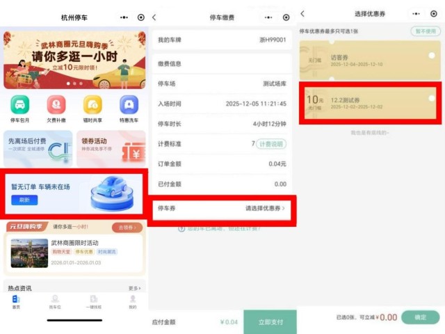 离场前打开“杭州停车”小程序,在首页点击车辆停车订单,进入支付页面,“选择优惠券”后点击“立即支付”完成缴费即可离场。