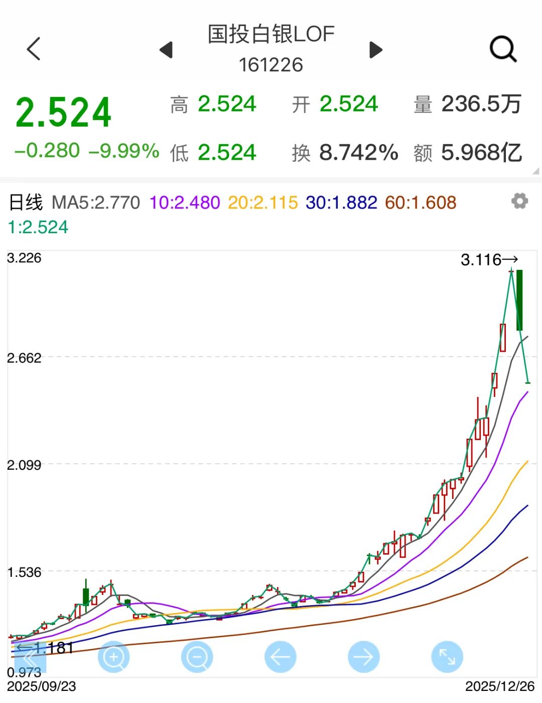 12月26日早盘,在停牌一小时后,国投瑞银白银期货(LOF)场内价格复牌便“直奔”跌停。截至收盘,其12月以来的涨幅已从此前一度超过100%,缩水至65%左右,场内溢价率快速缩减至30%以下。