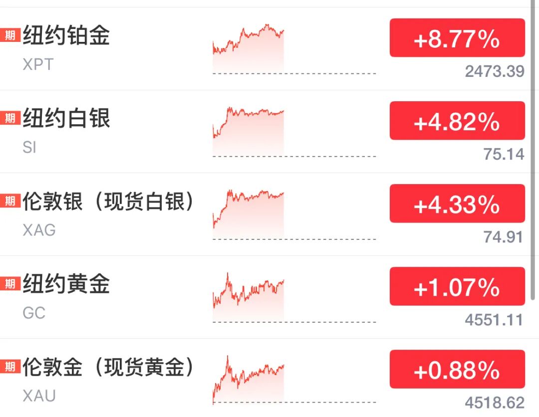 现货黄金盘中突破4530美元/盎司;现货白银突破75美元/盎司,日内涨超4.5%;纽约铂金突破2510美元/盎司,日内涨超10%。截至发稿前,黄金、白银、铂金均在上涨中。