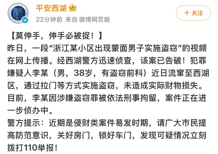 上午10点30分,西湖警方发布通报:昨日,一段“浙江某小区出现蒙面男子实施盗窃”的视频在网上传播。经西湖警方迅速侦查,该案已告破!犯罪嫌疑人李某(男,38岁,有盗窃前科)近日流窜至西湖区,通过拉门等方式实施盗窃,未造成实际财物损失。目前,李某因涉嫌盗窃罪被依法刑事拘留,案件正在进一步侦办中。
