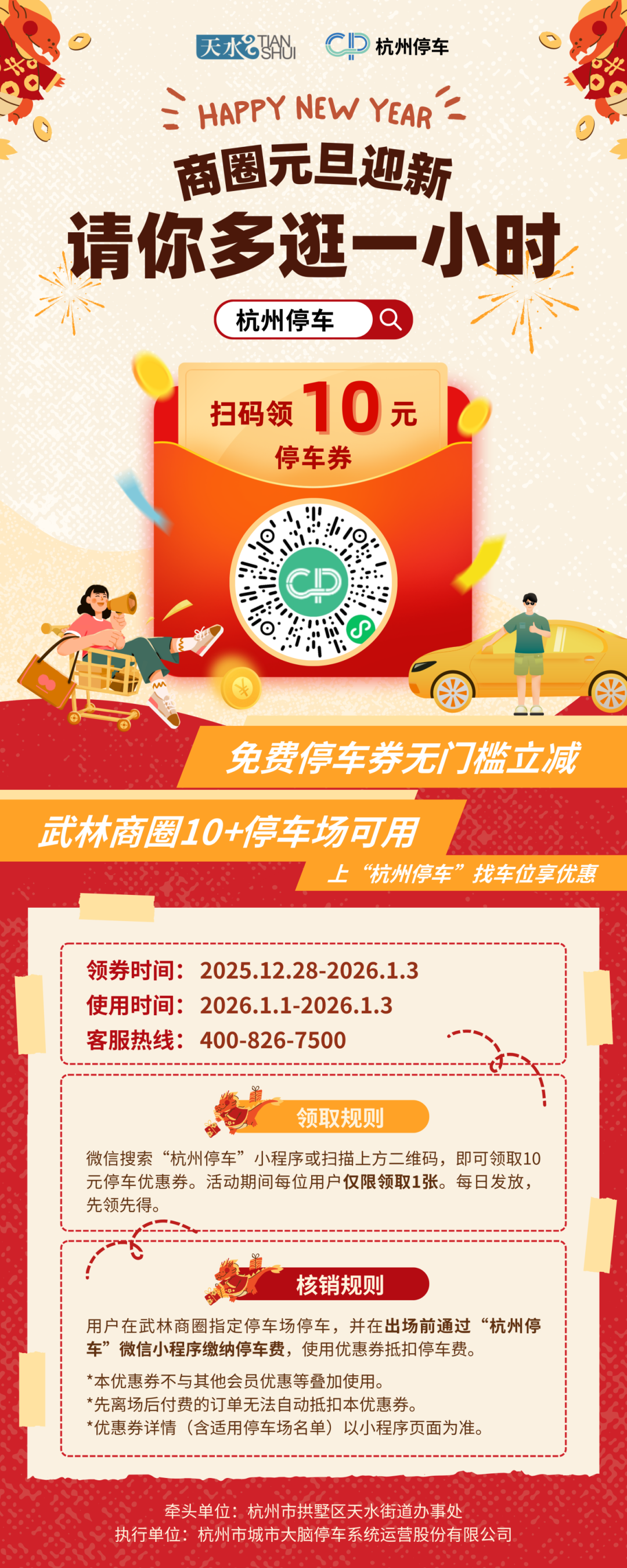 这批停车券可在武林商圈核心区10余个指定停车场使用,北至大运河,南至凤起路,覆盖超2500个车位。用“杭州停车”小程序还能实时查询车位余量、导航直达,省时省心。