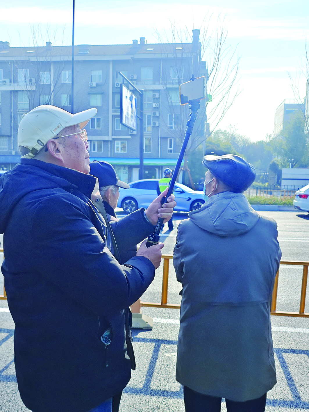 70多岁的王大伯家住朝晖,专门赶来现场看隧道开通,他架起自拍杆,记录这激动的时刻。