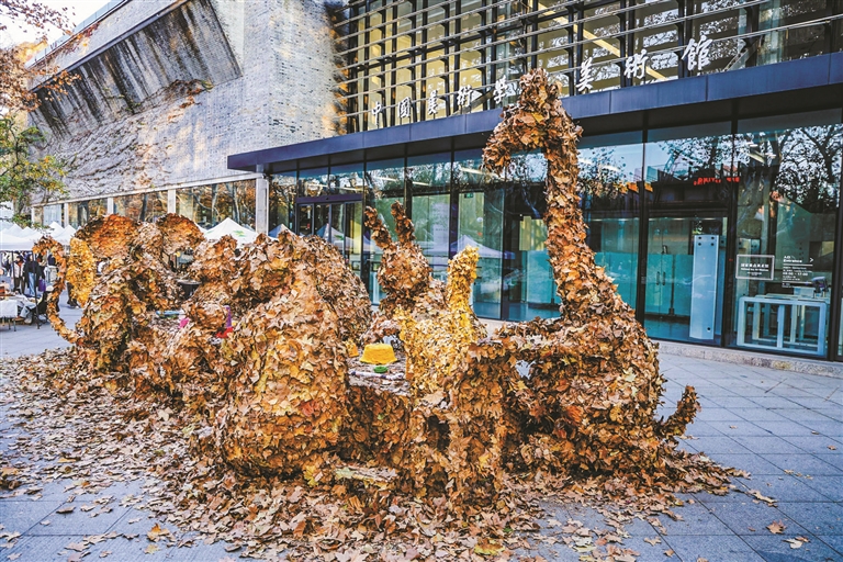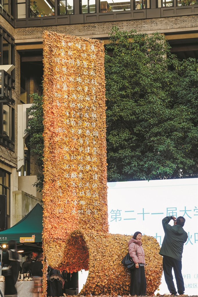 顺着“落叶地毯”走上台阶,会看到一件名为《风的来信》的落叶雕塑,作品形似信笺,呈现出一种富有张力的状态。作品上的文字来自诗人里尔克,在风中忽隐忽现。在这里,落叶从不是结束,而是一封可以投递、等待回音的温柔来信。