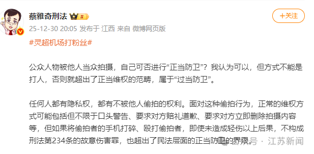 针对此事,微博网友“蔡雅奇刑法”作出解读:公众人物被他人当众拍摄,可以进行正当防卫,但方式不能是打人,否则就超出了正当维权的范畴,属于“过当防卫”。