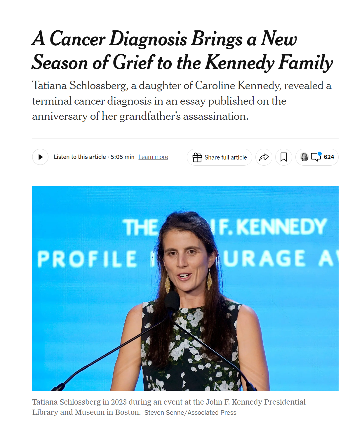 如今,肯尼迪总统的孙女也患上绝症,她自己撰文写道,“我一生都在努力好好生活,但我却给母亲、给我们的家庭带来了新的悲剧,而我却无力阻止。”