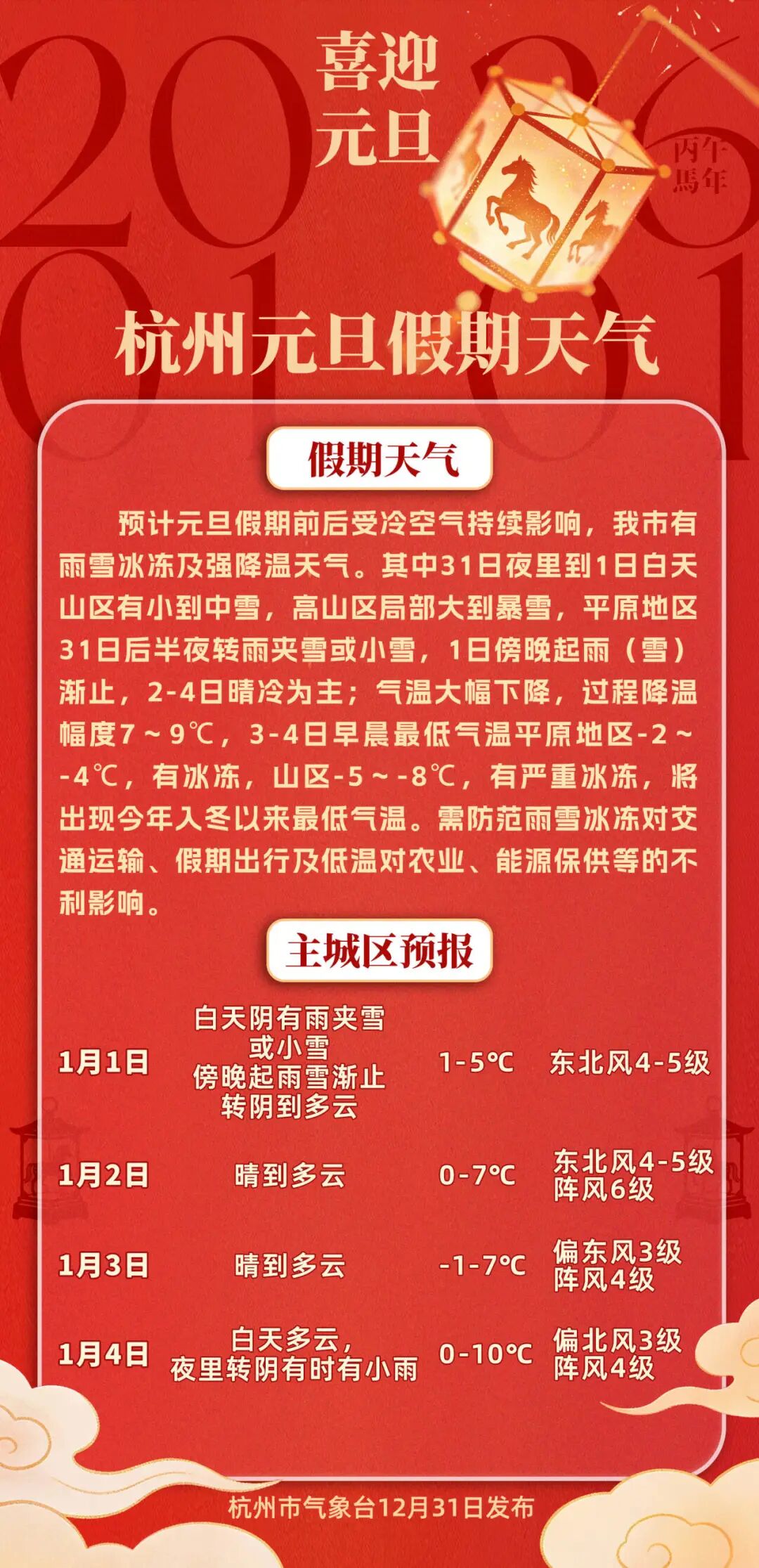 冷空气也赶在年末“刷存在感”,实力不容小觑!受其持续影响,预计元旦假期前后(12月31日-2026年1月4日),杭州将迎来雨雪冰冻及强降温天气。