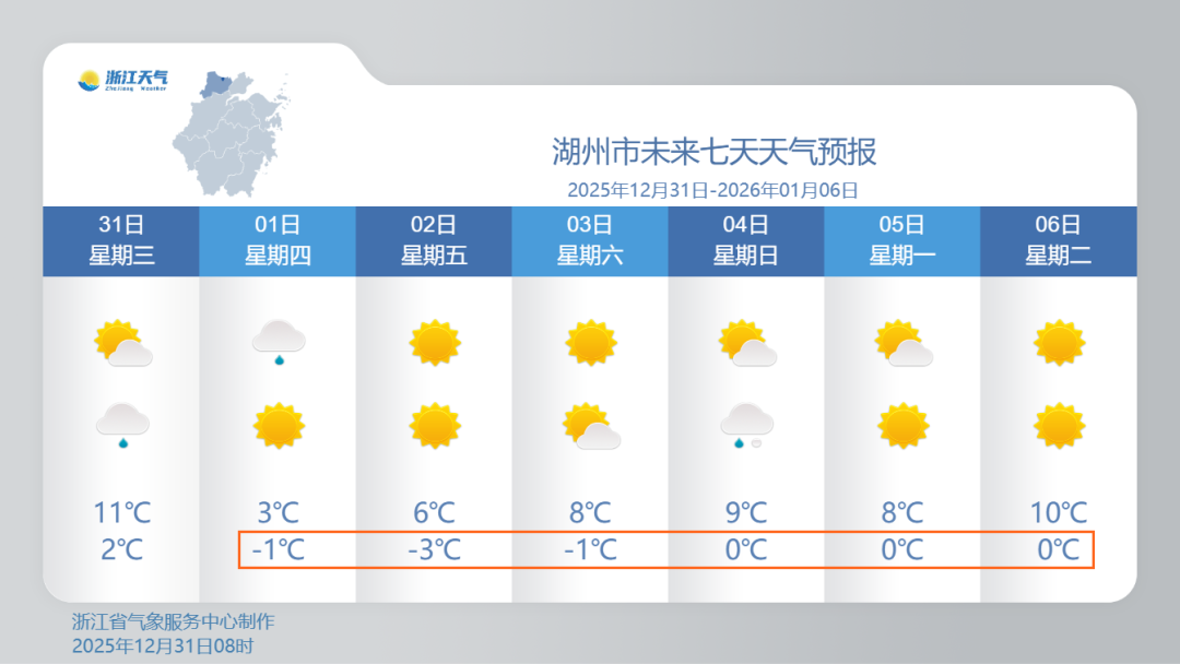 1月1日全省阴有小雨,浙中北和丽水北部地区部分有雨夹雪,其中浙北平原地区局部有小雪,部分山区小到中雪,浙西北高山区有中到大雪。