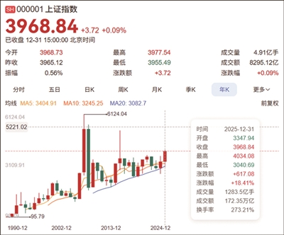 A股2025年收官虽然没能跨过4000点大关,但沪指迎来11连阳(含12月30日一根假阳线),全年累计上涨18.41%,创下自2019年以来最佳年度表现。
