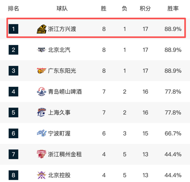 广厦男篮近期取得七连胜,前九轮战绩8胜1负,成功登顶积分榜首。