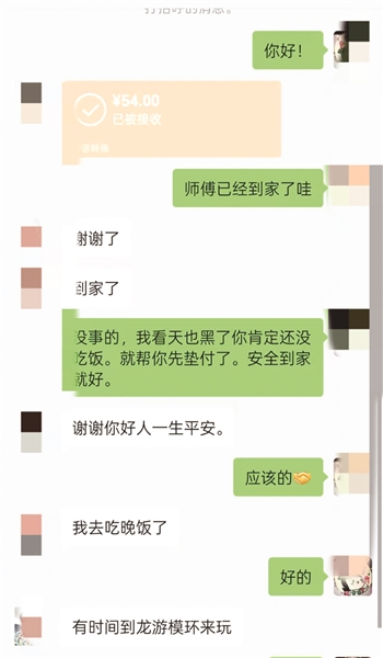 “过了20多分钟,大姐来找我,说联系上家里人,把钱转给我了。她一直感谢我,我都不太好意思了,大家出门在外总会遇到急难事,能帮一把是一把。”胡江伟说,2025年他为司机垫付过6次,“后来都还给我了。”