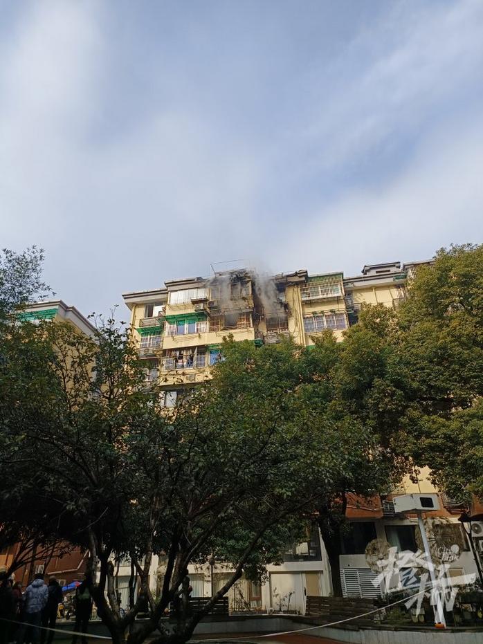第一个发现失火的王奶奶说,火灾发生的时间在8点半后、9点不到。她8点半吃好早饭,闻到有股烧焦的味道,跑到走廊去问,还喊过但没人应答,于是走下去看,发现楼下6楼房子往外冒烟,才知道是失火了,第一时间通知了小区保安,保安上楼查看后报的警。