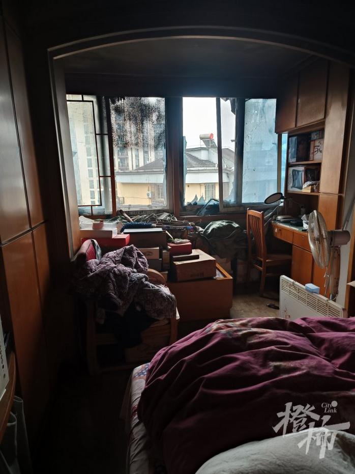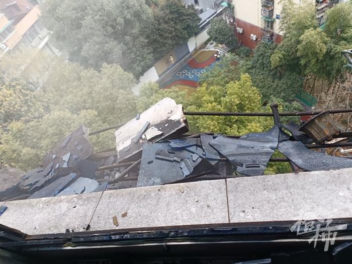 701室王奶奶家,朝南的阳台窗及卧室窗玻璃大面积爆裂,大量的玻璃碎块堆积在室外的花架里,存在高空坠落风险,需及时清理,室内墙壁呈现熏黑状。记者还注意到701室北侧的雨蓬也出现多处破损,601室这场大火从南侧蔓延到了北侧。