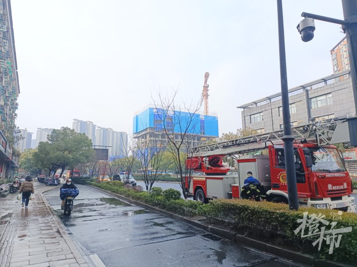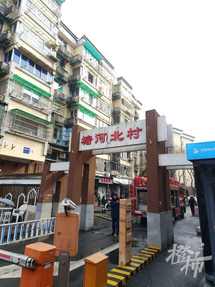 现场一共停着四辆消防车——塘河北村北侧的教工路上停着两辆,塘河北村北大门入口处和2幢楼下各停着一辆。