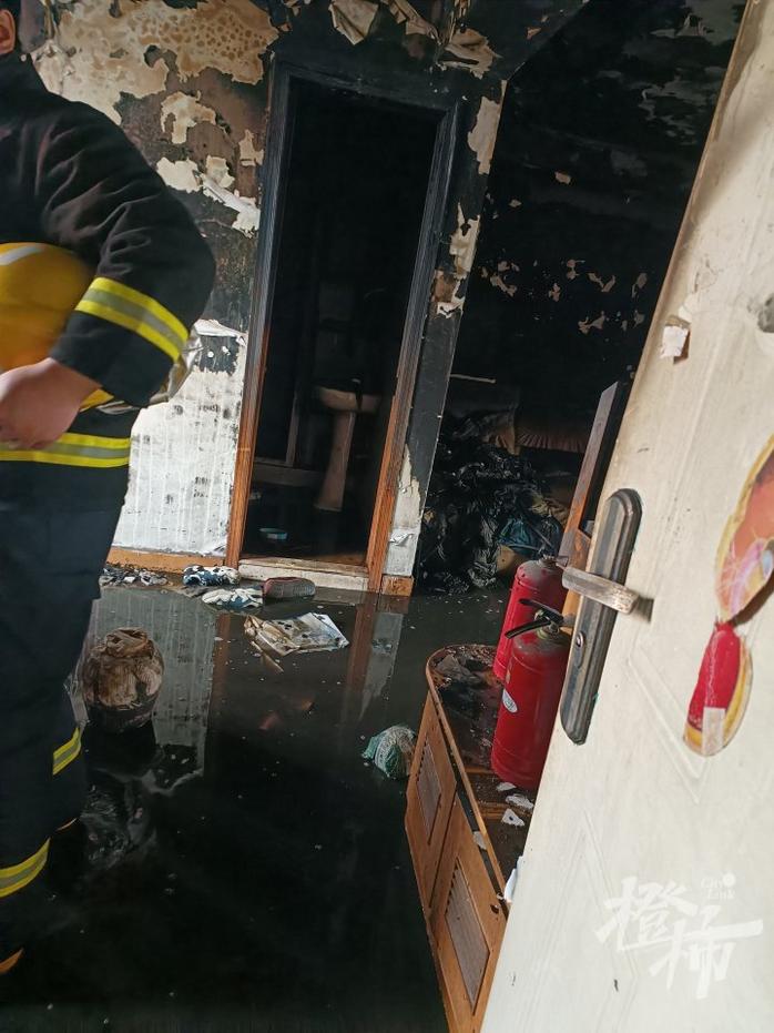 记者在现场看到,601室失火这户室内屋顶、墙壁均被熏黑,并伴随大量的开裂起皮,客厅的皮沙发也成了黑色,整个室内看起来一片黑漆漆的,地上都是灭火后留下的积水。