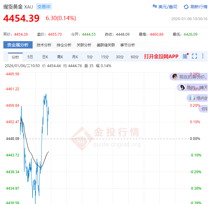 周一(1月5日)纽约尾盘,现货黄金涨2.64%,报4446.50美元/盎司。COMEX黄金期货涨2.96%,报4457.60美元/盎司。截至发稿,现货黄金报4454.39美元。