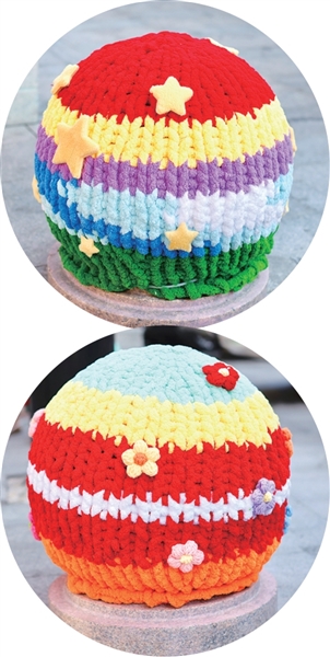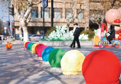 吴山路口的一排石墩子是纯色的“毛衣”,其中3个还“发芽”长出了绿叶子,变成了橘子造型;解放路停车场边上的石墩子就比较鲜艳了,每个都穿得五颜六色,还点缀着毛球、花朵、星星等小装饰。